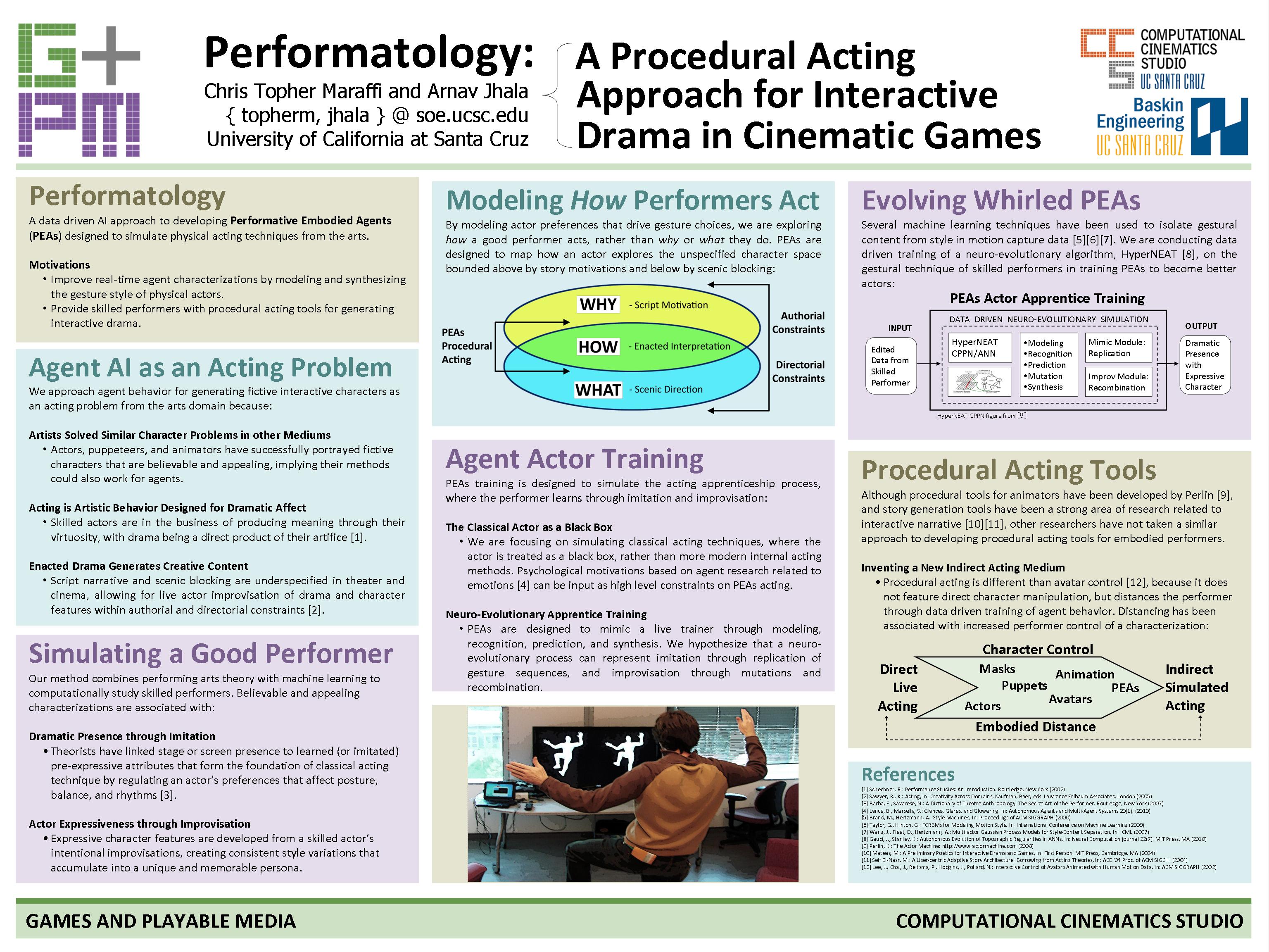 Performatology is a research area and critical approach to game theory that I developed for my UCSC graduate thesis in Computer Science, and which led to a computational method for studying artistic forms of gesture. The concept was developed as a critique of more common areas of game studies such as Narratology and Ludology, which focus on story and play, but underrepresent the importance of artistic figure representation in interactive media. As games have moved towards interactive cinema, like the latest Tomb Raider or Uncharted titles, it becomes increasingly important to address problems related to generating a dramatic gestural performance by virtual characters. Performatology was developed in Arnav Jhala’s lab, the Computational Cinematics Studio, which was part of the Games & Playable Media research center at UCSC.