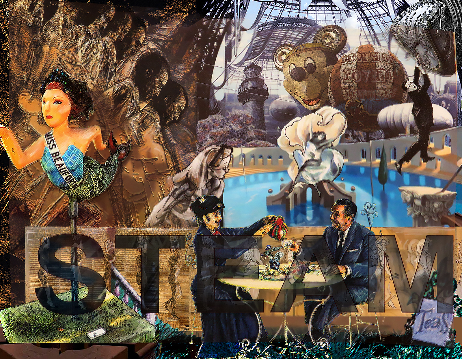 “STEAM: Disney & Dali Have Tea at the Beaufort World’s Fair” (17”x22”), Media Design digital compositing demo with samples of Salvador Dali, Walt Disney, Marcel Duchamp, and Harold Lloyd imagery, printed on matte paper and clear acrylic sheets, enhanced with physical media and affixed to layers of glass, Fall 2016.