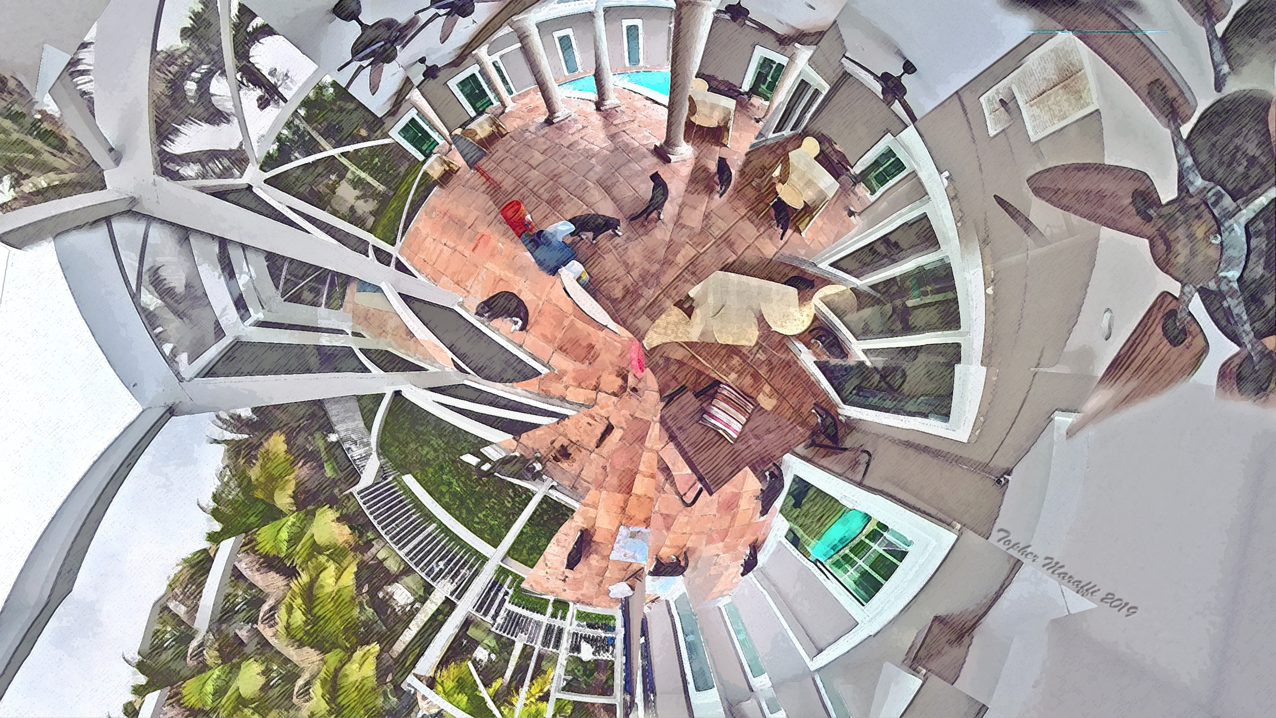 The new aesthetic of 360 photos and videos is only possible by using software to stitch many images together, which is very similar to Hockney’s joiner collage technique. The resulting composite can be flattened out on a 2D plane to create a “tiny world” image, or it can be wrapped on the inside of a 3D sphere to create a virtual environment. I am now using the new 360 video cameras to create spherical joiners that capture a sequence from different positions in space, such as this one of my cat walking around our patio.