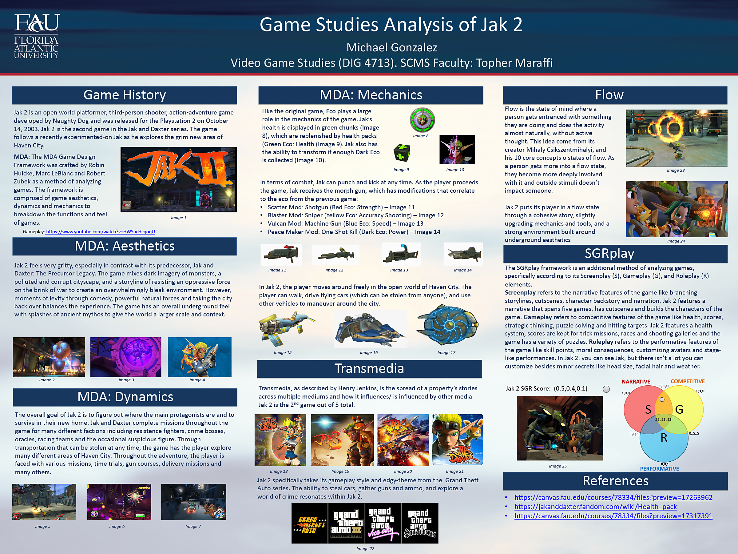 My game studies students used this framework with other popular design frameworks like the MDA (Mechanics, Dynamics, and Aesthetics) and Flow concept to do a formal analysis of games they played. Here are a sample of game analysis research posters from the course: