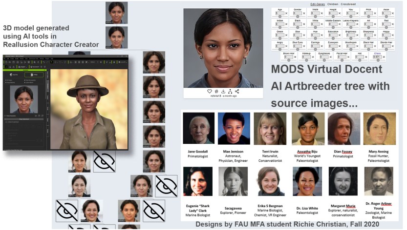 2019-2020 graduate student Richie Christian started pre-production on a Prehistoric Florida AR project in my 3D Production for Interactivity (DIG 6547) MFA course, and then created a VR simulation of the AR app using 360 imagery of MODS and lip syncing on a virtual 3D docent. Here is a video of the preproduction designs and VR test: