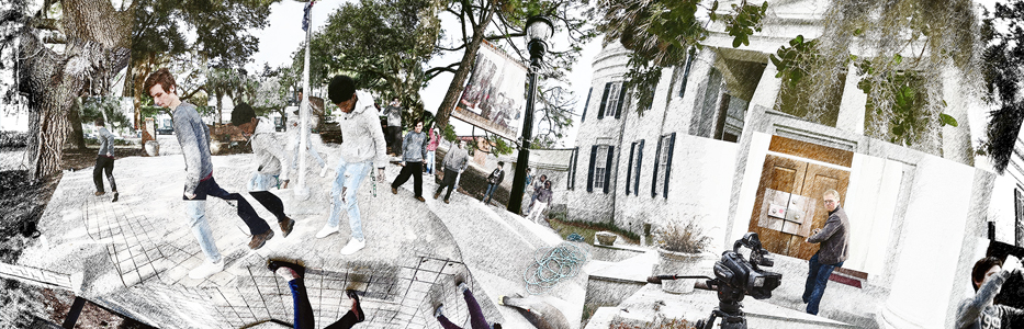 “Broadwalk Joiner” Hollywood Beach 360 tiny world digital composite by Topher Maraffi, 2019.“The Southernmost Joiner” Key West 360 tiny world digital composite by Topher Maraffi, 2018.“Somewhere Over the Rainbow” Disney Springs 360 tiny world digital composite by Topher Maraffi, 2019.“Quiet Before the Dancing” Delray Beach tiny world digital composite by Topher Maraffi, 2019.“Le Petit Princess de Sanibel” 360 tiny world digital composite by Topher Maraffi, 2019.“Totem in Miami” 360 tiny world print by Topher Maraffi, 2019.“Miracle Joe Searching for Che Che” 360 Joiner digital composite by Topher Maraffi, 2019“Savannah Riverfront” 360 tiny world print on canvas (38×38 inches) by Topher Maraffi, 2018.“Savannah Tree Squared” (Detail) 360 print on paper (24×36 inches) by Topher Maraffi, 2018.“Savannah Market” 360 tiny world print on paper (26×32 inches) by Topher Maraffi, 2018.“Aliens Among Us” 360 tiny-world digital composite by Topher Maraffi, 2018“I’ll Go Walking, After Sunset” Anaheim Convention Center 360 tiny world digital composite by Topher Maraffi, 2018.“Hockscotch World” David Hockney inspired 360 joiner digital composite print on canvas (38×38 inches) by Topher Maraffi, 2018“Hockscotch at the College Building” David Hockney inspired joiner digital composite print on canvas (55×25 inches) by Topher Maraffi, 2018“Self Portrait Meme”, digital composite print on canvas (32×24 inches) and painted with acrylics by Topher Maraffi, 2018.“Lab Monitor” Joiner digital composite print on canvas (36×32 inches) and acrylic painting by Topher Maraffi, 2017.“POV: Hitch Throws the Sign to Grasshopper” digital composite print on canvas (42×26 inches) and acrylic painting by Topher Maraffi, 2017.“STEAM: Walt and Dali have Tea at the Beaufort World’s Fair” mixed-media digital collage on layers of glass (15×12 inches) in homage to the multi-plane camera, 2016.“Ritual Fire of Grief” acrylic on canvas painting in four panels, 2014 USCB Faculty Exhibition.