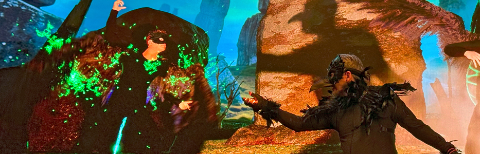 This hyper-reality adaptation of the opening scene of Macbeth is meant to demonstrate some of the ways that a theatrical treatment of Metahuman interaction in a virtual production volume can create mixed or extended reality effects (MR/XR) for a live audience that don’t require expensive and distracting headsets. To treat Metahumans as performing objects with the criteria of Craig’s super-puppet design requires real-time blending of refined performance capture data that we are blending performance capture animation montages and visual effects sequences in real-time by coding state machine changes in Blueprints. To create the illusion of liveness we are building improvisation into the actor affordances for triggering state changes as shown in this video for SIGGRAPH 2025 Spatial Storytelling program: